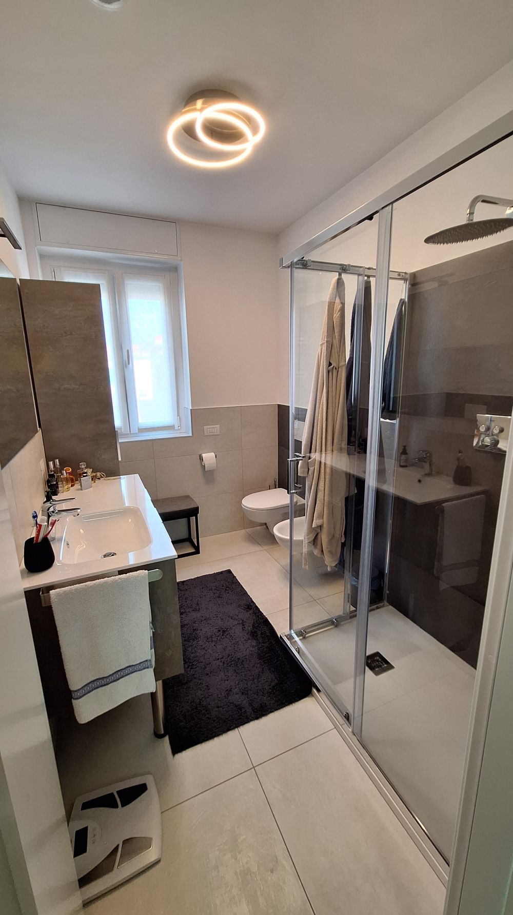 Riscaldamento a pavimento e a pompa di calore, raffrescamento, deumidificazione, ricircolo d'aria interno, cappotto termico, predisposizione domotica, tapparelle elettriche, serramenti in doppio vetro con apertura classica e a vasistas, sanitari sospesi, scalda-salviette, struttura antisismica, pannelli solari per la produzione di energia elettrica condominiale